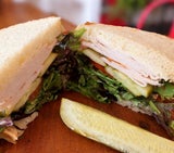 Turkey, pickles, lettuce, and tomato on Asiago bread